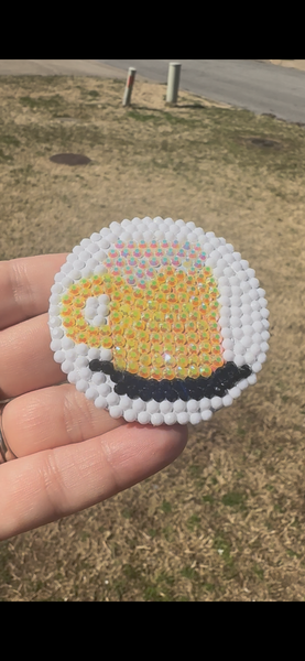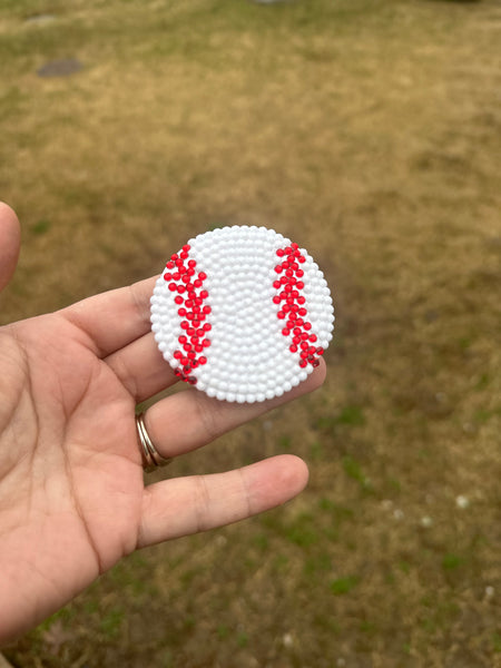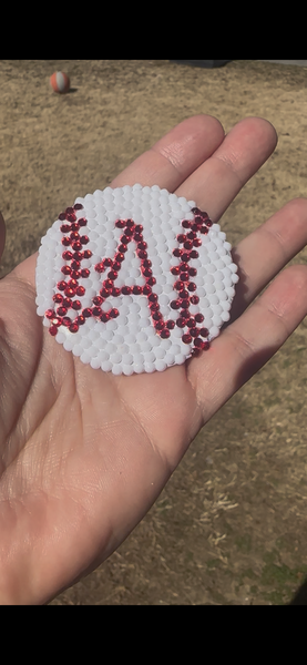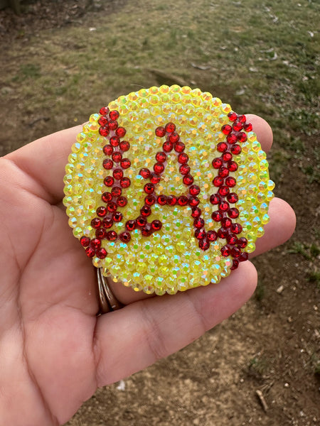 Each rhinestone is added by hand on these beautiful pins! Sure to stand out in the stands when the sun hits the bling. Secured by weather proof glue these pins can be worn over and over again. 2.25”