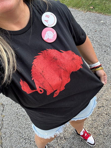 This distressed running pig will be your new go to tee! Our special pink running pig tee is to bring awareness to breast cancer and a portion of the proceeds will go to the Susan G. Komen foundation to help find the cure for cancer. These tees are unisex and true to size. S-3XL